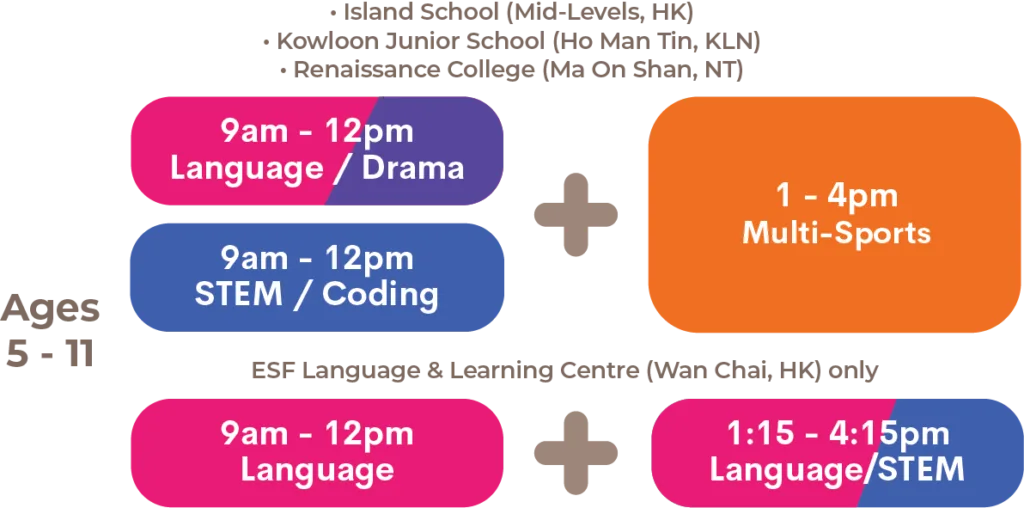 *Wet camps (water play session included) is available at Island School and Renaissance College, whereas Dry camps at Kowloon Junior School do not include any water session. Wet camp includes a 30-minute water session everyday, but previous swimming experience is not required – children will only engage in fun activities in the pool with the support of underwater platforms. Children will need to change into their swimsuit for the water session as they will be entering the pool everyday. Please prepare a swimming suit, swimming cap, google and towels to bring to class.